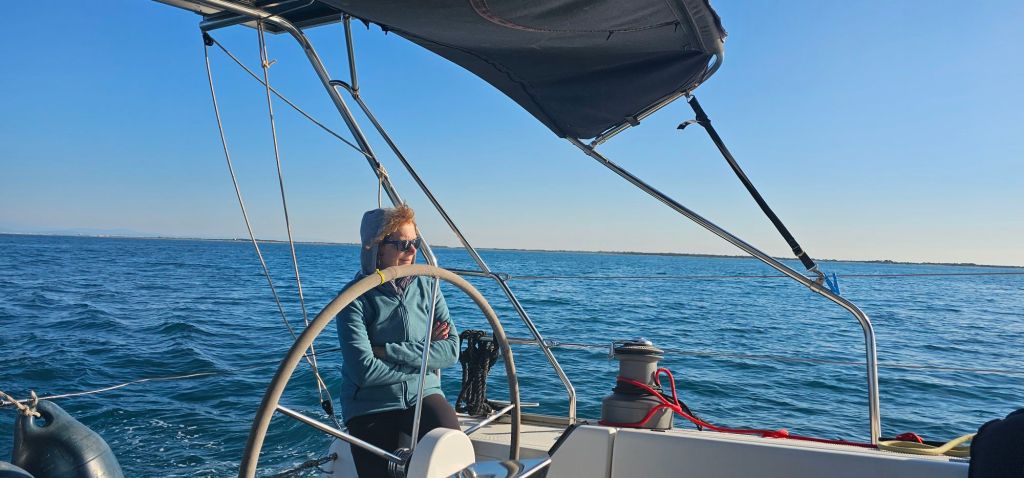 La météo annonçait à partir de Sainte Marie de la Mer 15kn de vent à peu près (27 km/h) au portant (venant du sud ouest) finalement on a eu 5 à 7 kn donc moteur plus voile et un peu de pure voile.