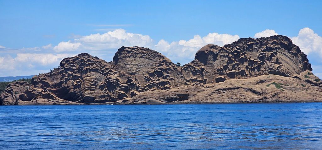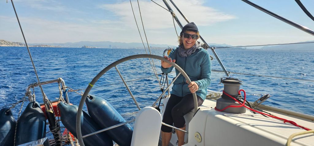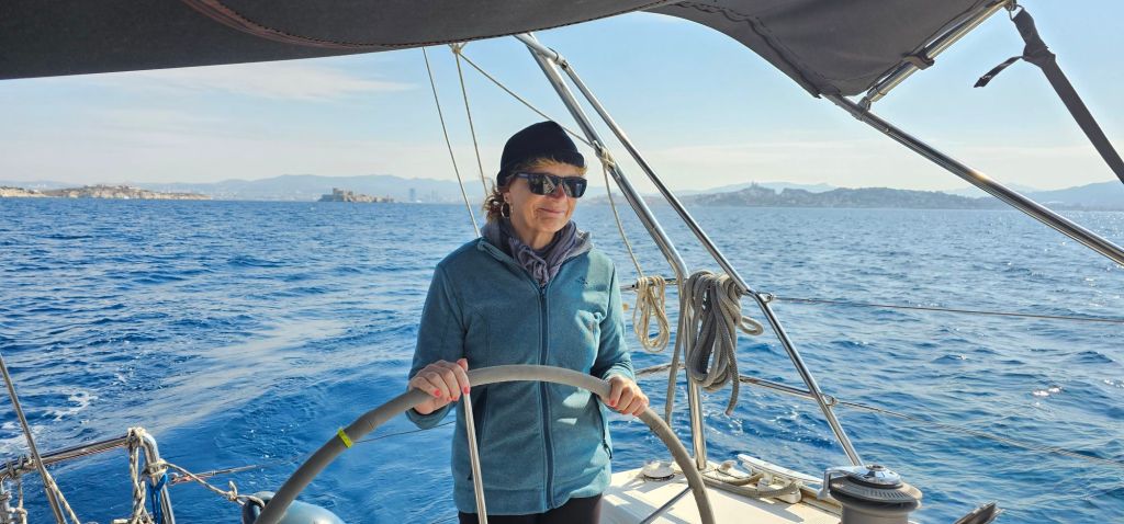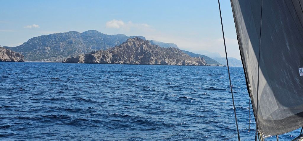 Finalement la brise thermique nous a permis de partir à la voile ⛵️ jusqu’à l’entrée des Calanques (passage entre l’île Maire et l’île de Jarre)