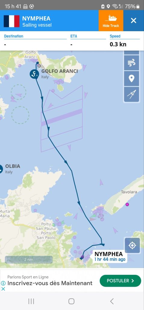 On a tenu pendant environ 1/2h une vitesse entre 8 et 8,5 knts, après quoi il m’a semblé sage de calmer le jeux afin de préserver l’harmonie à bord pour le restant de la journée 😅