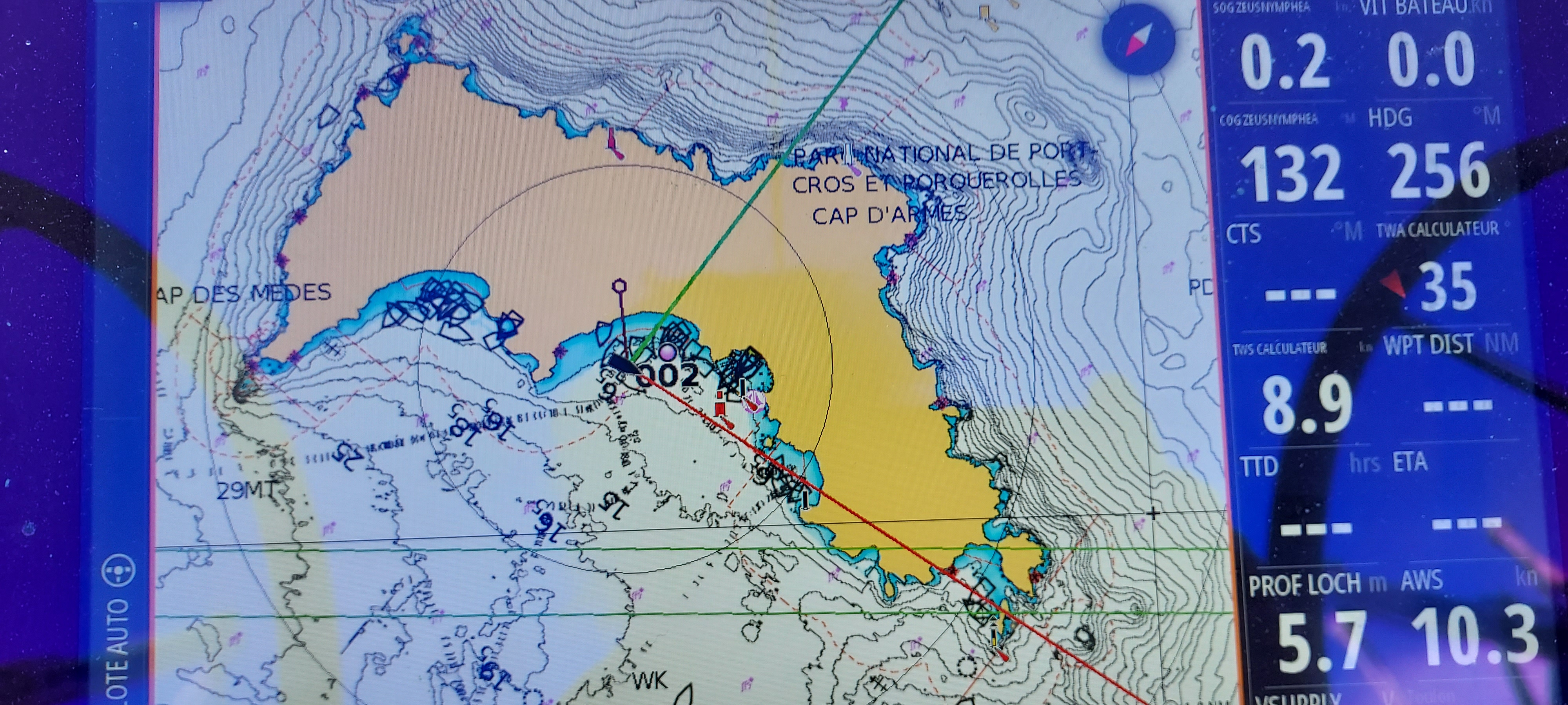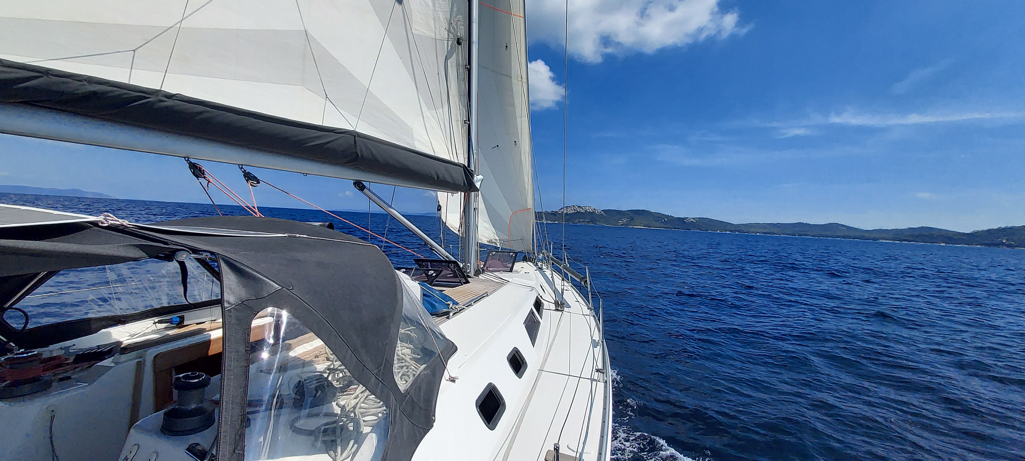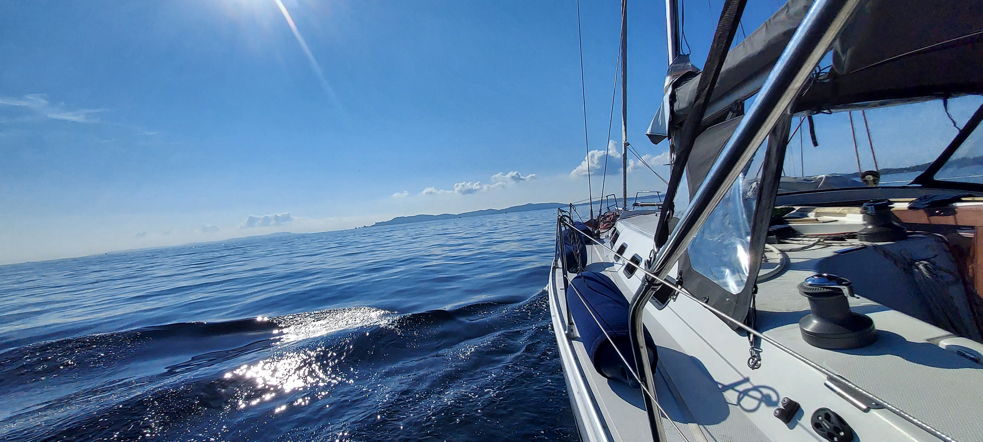 Samedi à 10 h départ de Hyères pour une première journée de navigation, essais de mouillages. La météo à été très sympa avec nous avec un vent oscillant entre 7 et 11 Kn (soit 13 et 20 Km/h) et une mer plate.