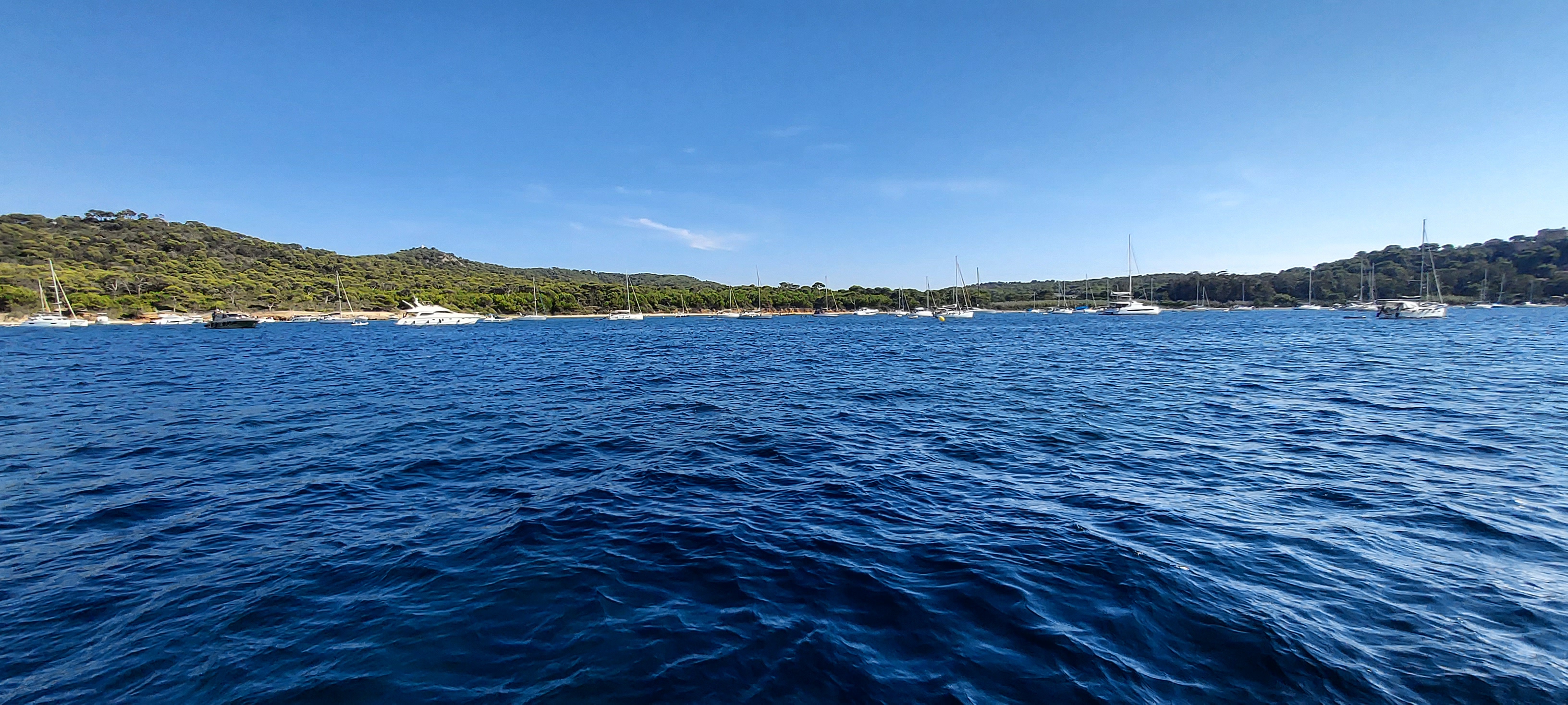 Ce soir mouillage à Porquerolles, un peu agacés en fin d’après midi par la valse des bateaux à moteurs qui se sentent obligés de montrer qui est le plus fort, puis par un cata plein de gamines avec la musique à fond !!. Heureusement c’est bientôt la rentrée et les plans d’eau vont retrouver la sérénité.